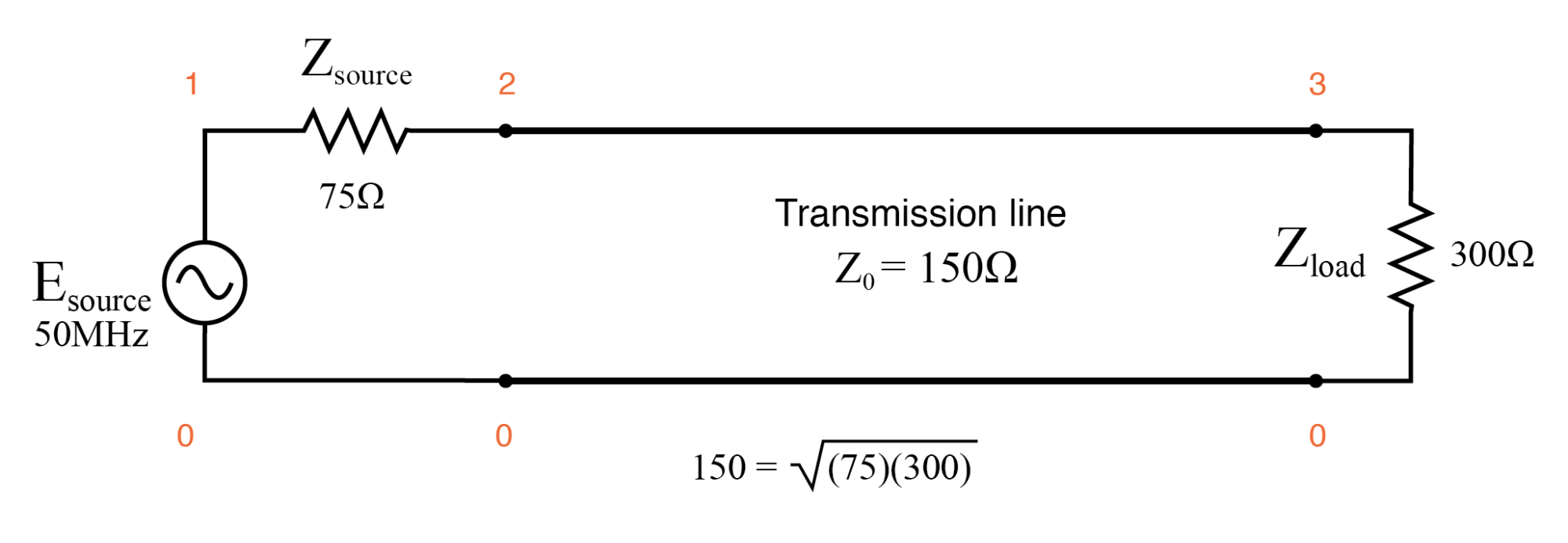 Transmission line v1 1 0 ac 1 sin rsource 1 2 75 t1 2 0 3 0 z0=150 td=5n rload 3 0 300 .ac lin 1 50meg 50meg .print ac v(1,2) v(1) v(2) v(3) .end